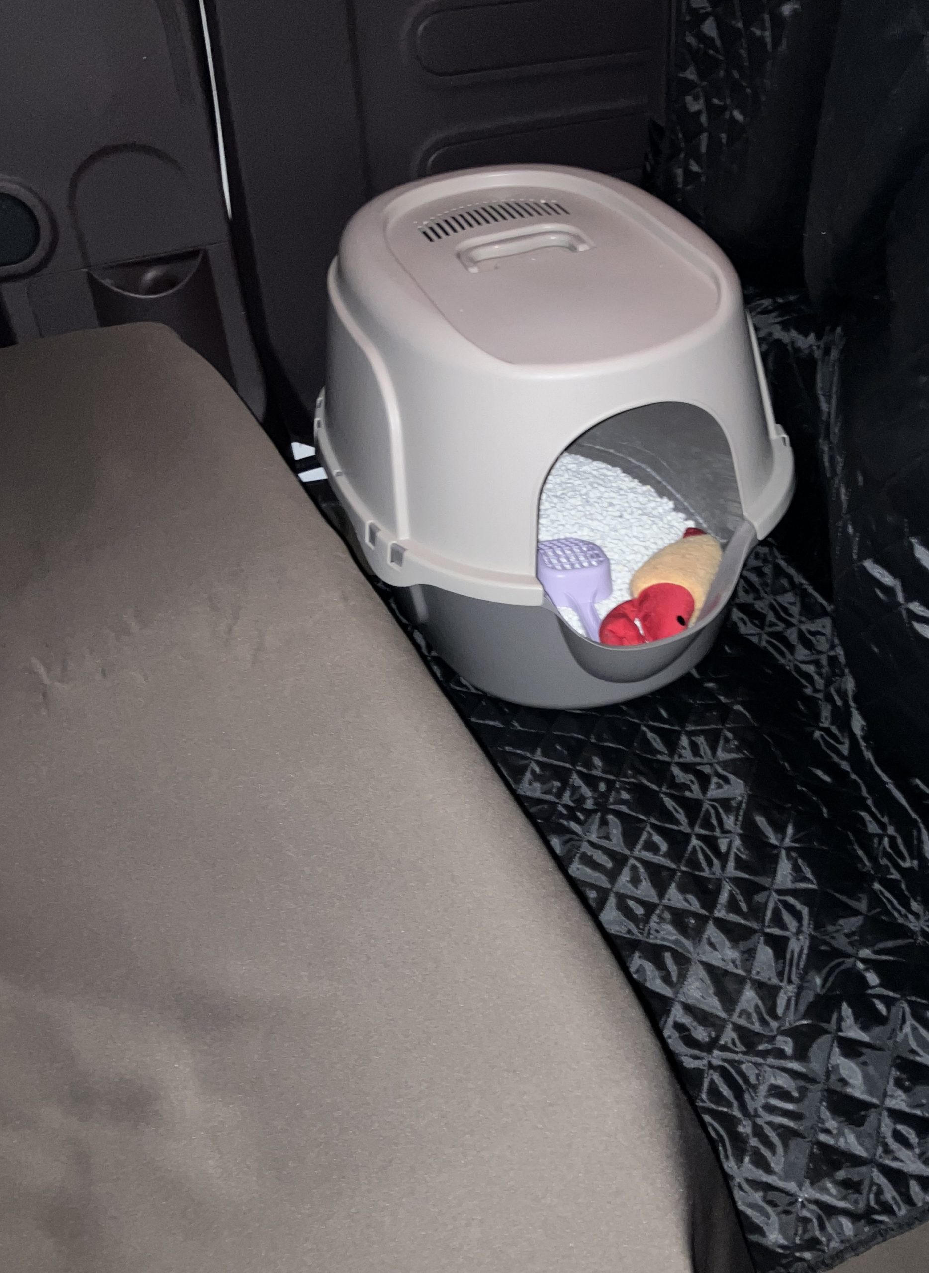 車やペットタクシーで移動すると飼い主様の持たれてる猫用トイレ置き、乗車後少しケージやリュックから軽く出してあげていつでも使用出来るようにする事も可能です。上に蓋があるタイプですと猫ちゃんの避難場所にもなって自分の匂いがするから、中で落ち着いてくれる子もいますよ🐈