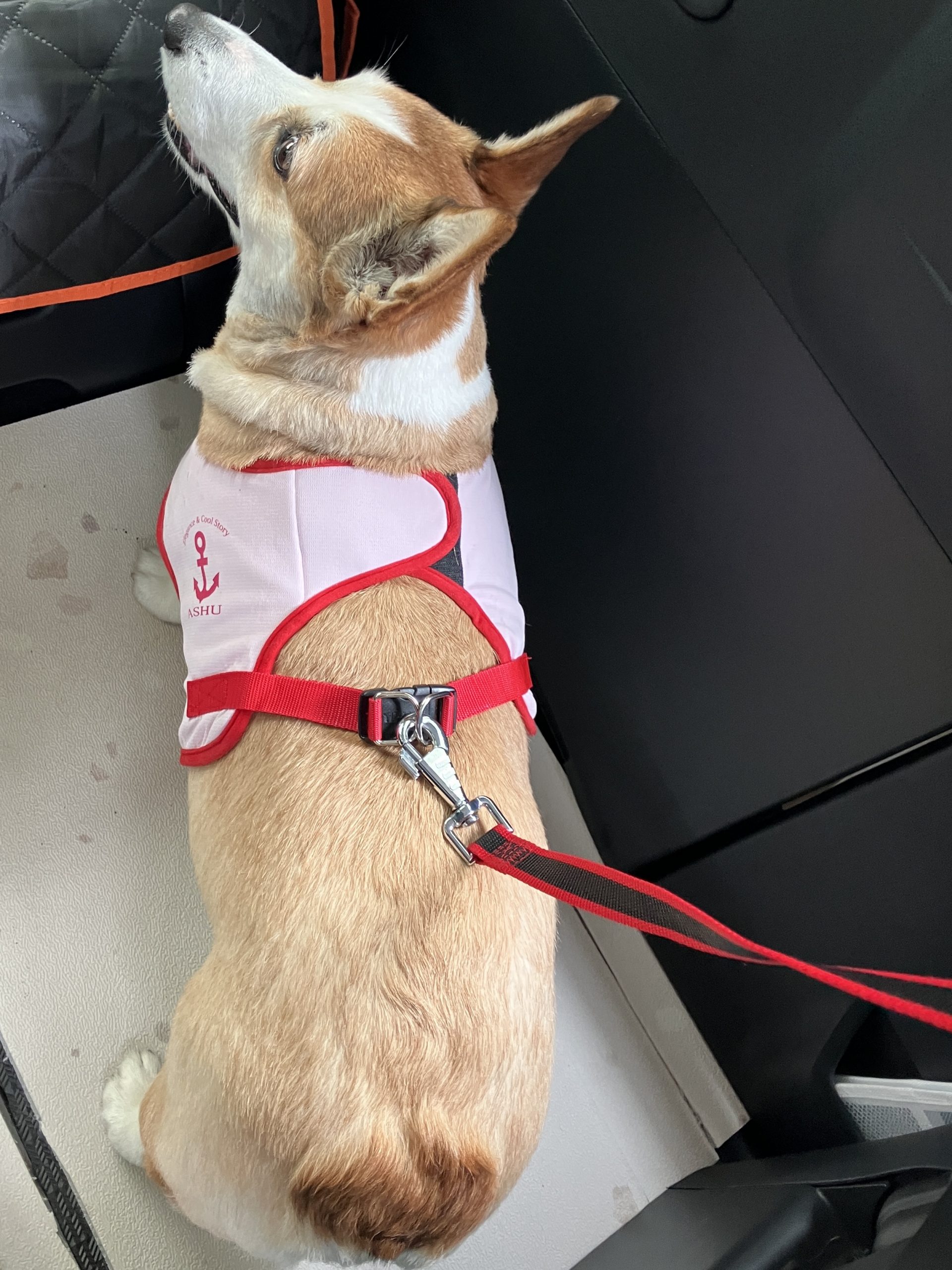コーギーちゃんをペットタクシーでお迎え、ドアを開けると自分から乗車してくれて定位置にいます😊いつも撫でてって来てくれるので担当も嬉しいです。
