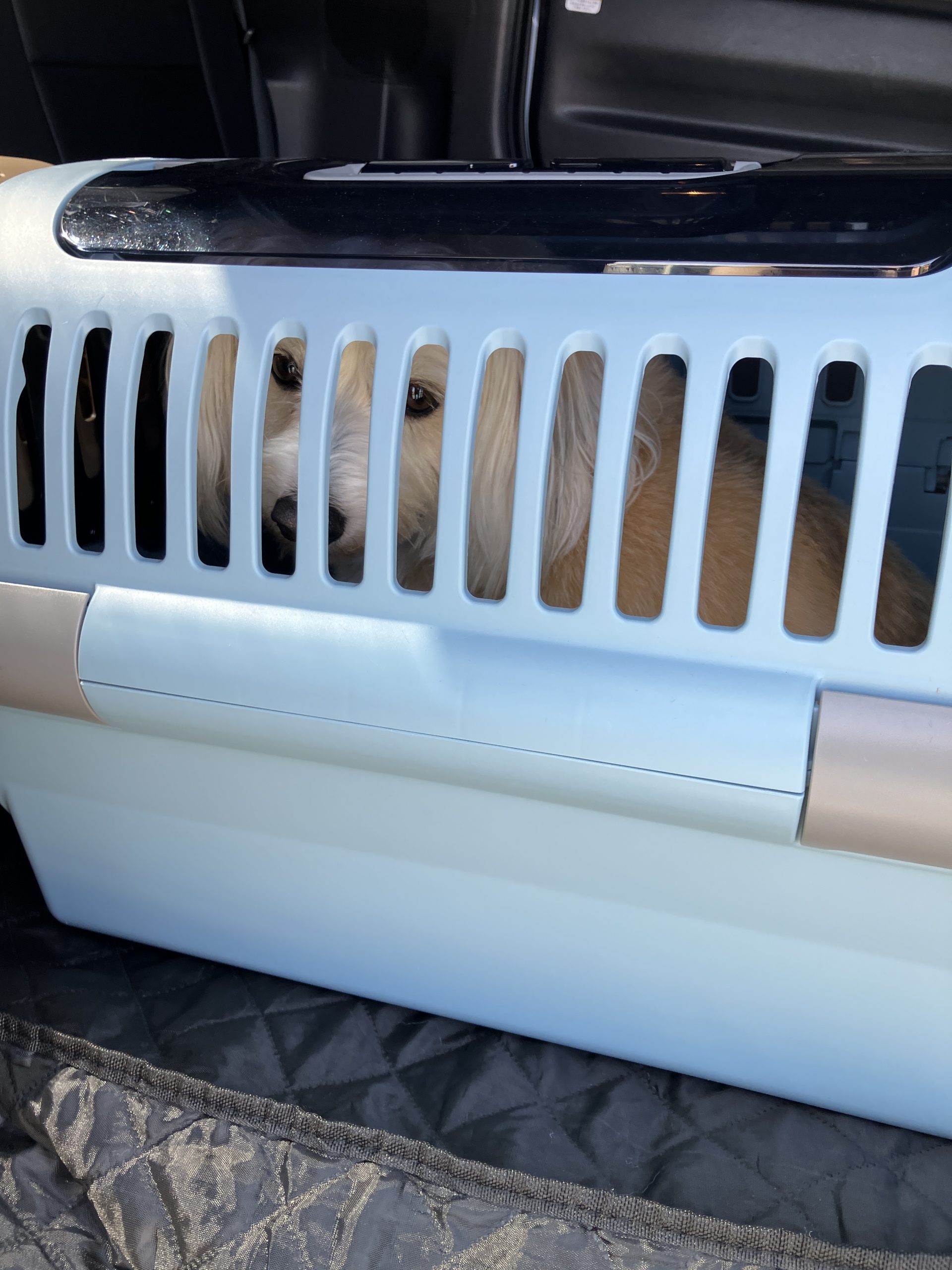 車内のクレートで少し緊張しながらも、お利口さんに目的地まで到着しました。