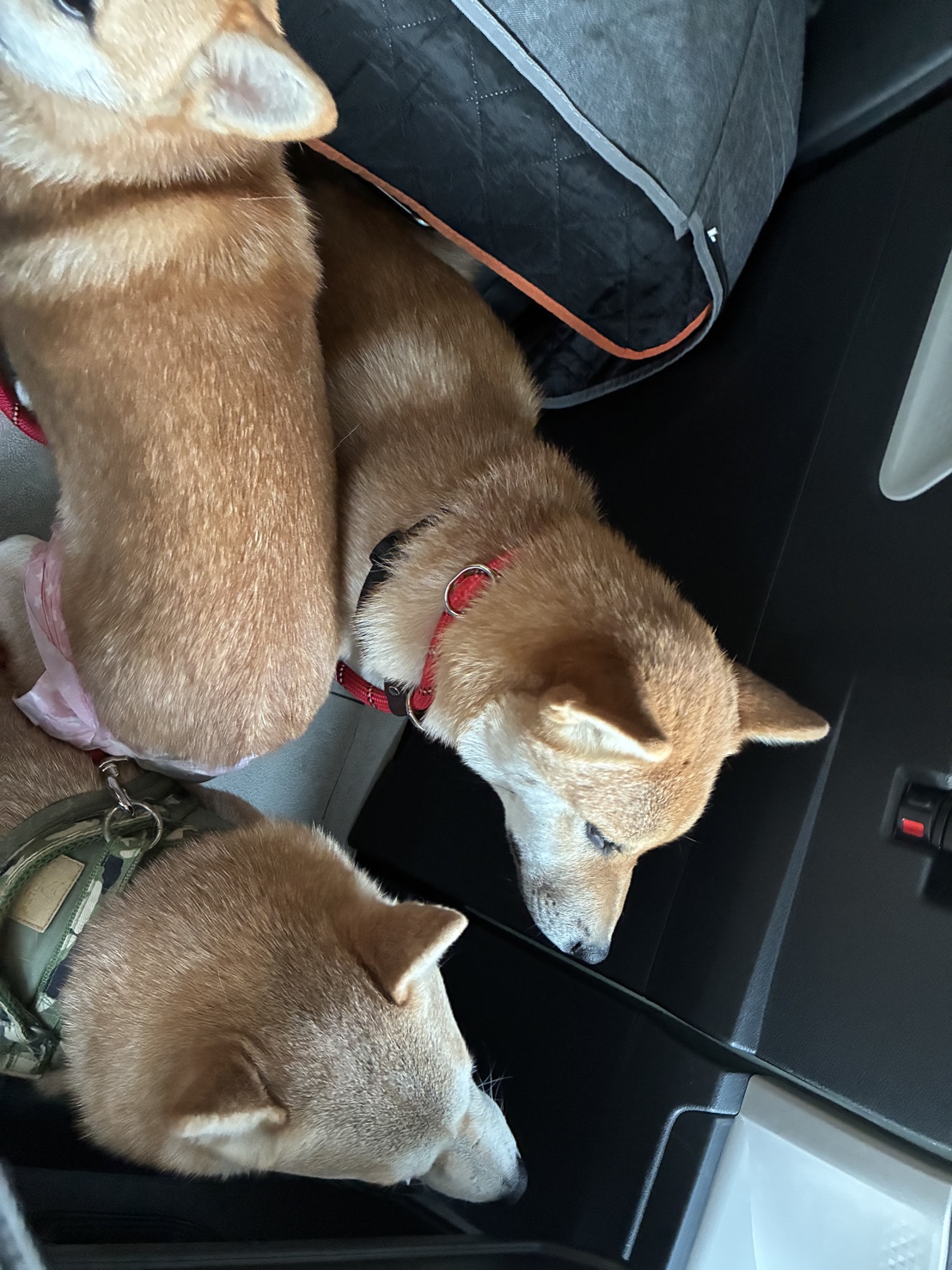 診察を頑張ったあと、飼い主様がお会計をされている間、柴犬さんたちは車内でお留守番です。