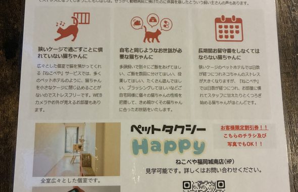 ねこべや福岡城南店にショップカード設置|ペットタクシーHappy【福岡市・猫送迎】